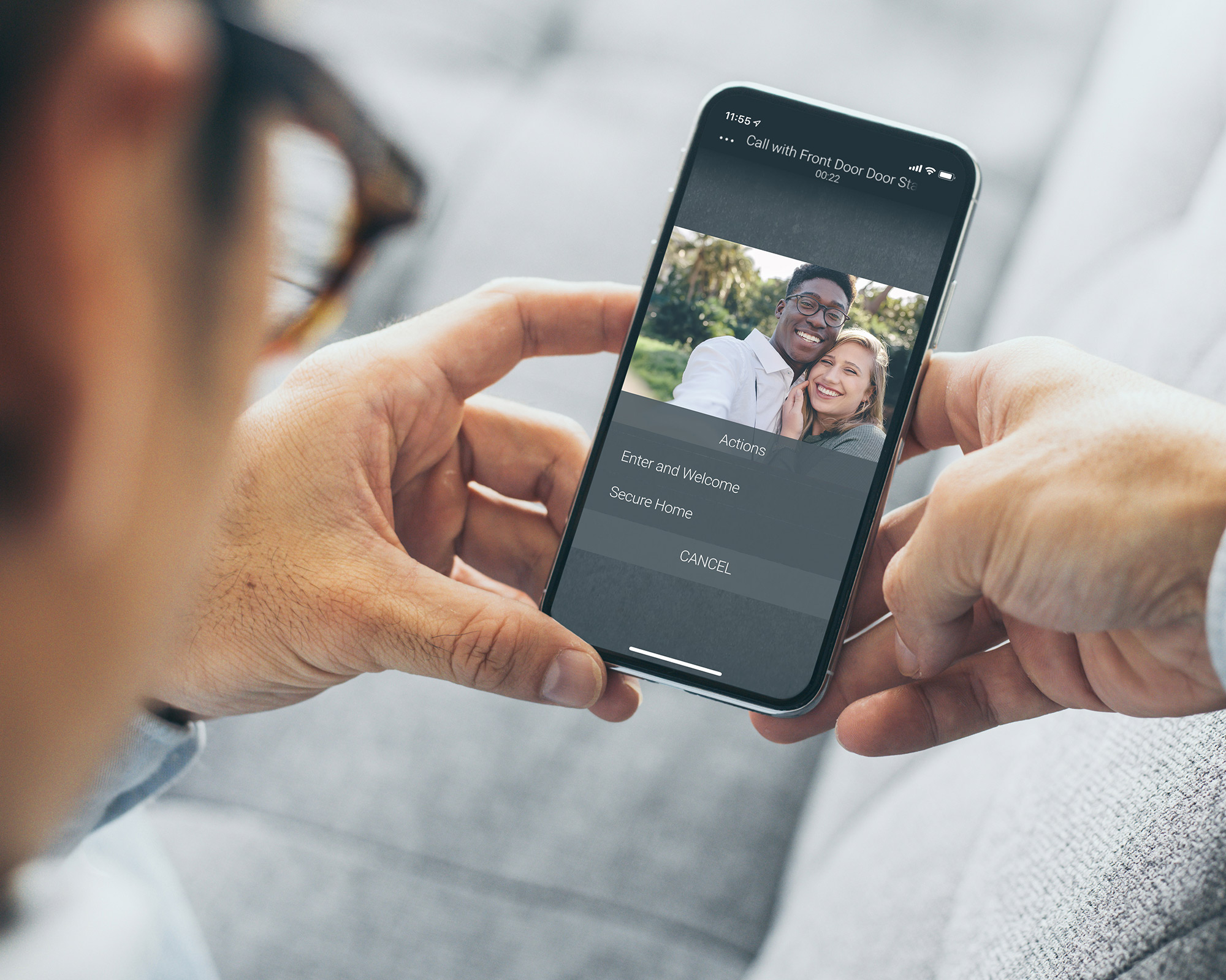 Running late? Answer a guest’s ring and disarm the alarm, turn on lights, or open the garage for them to enter.